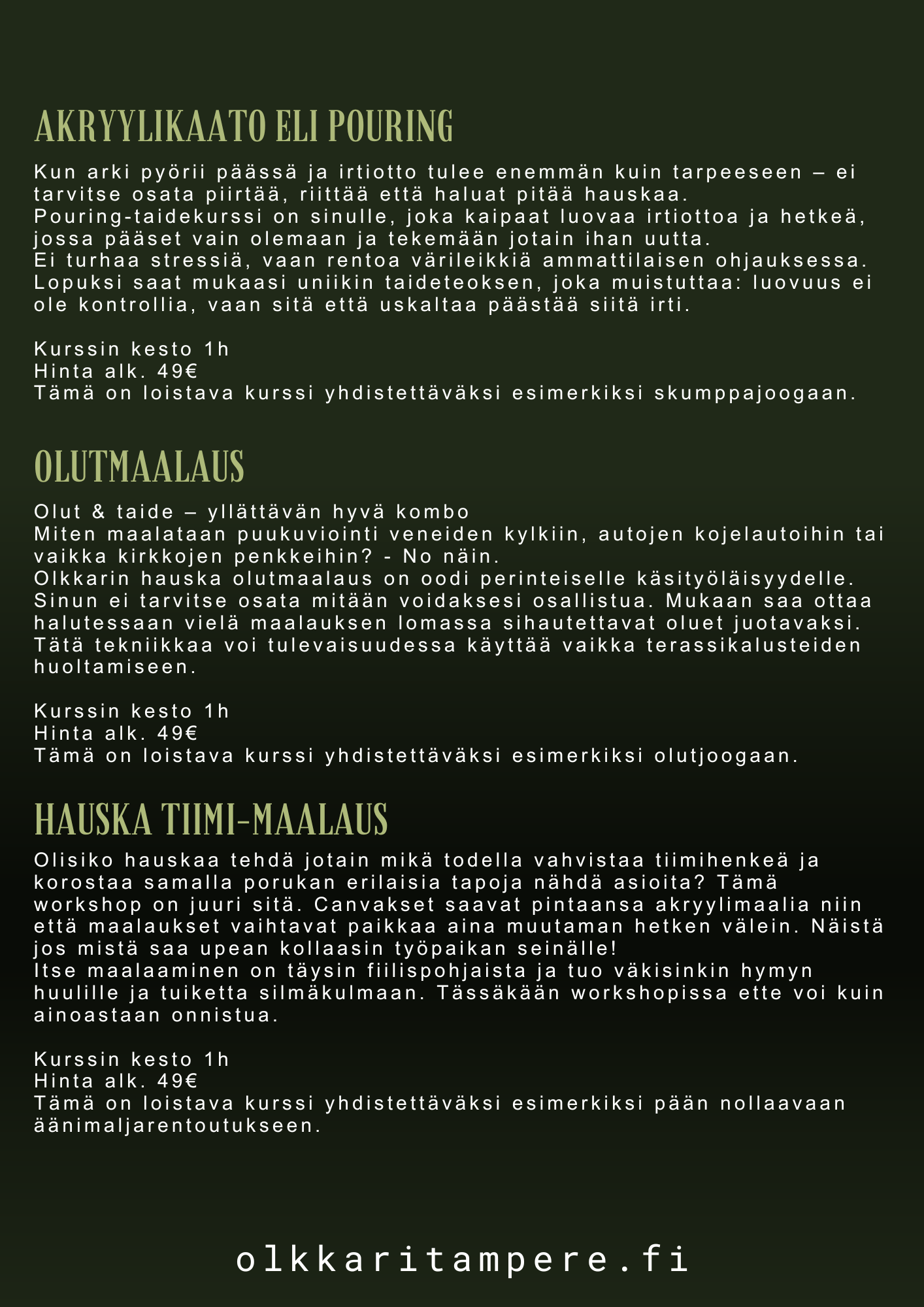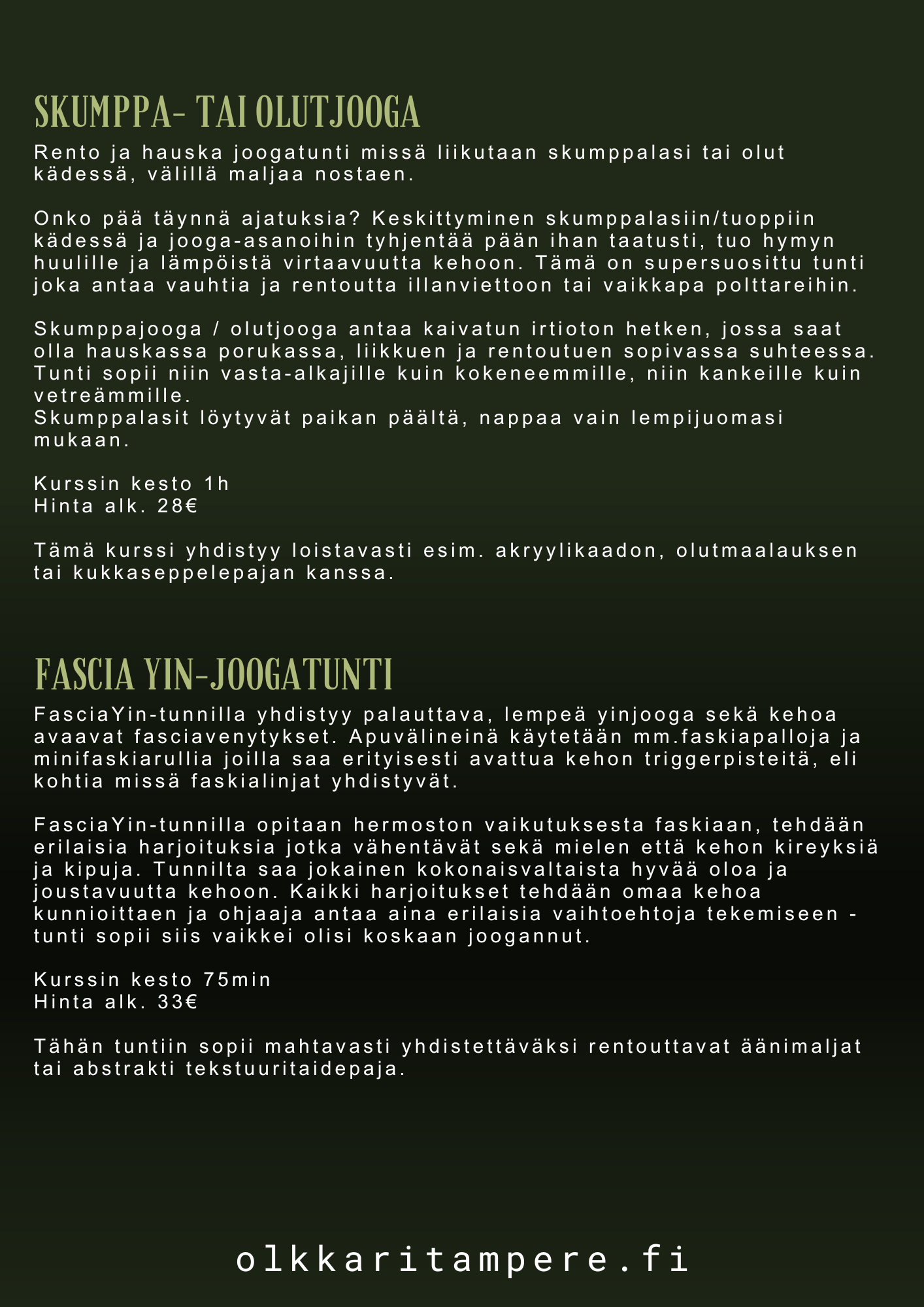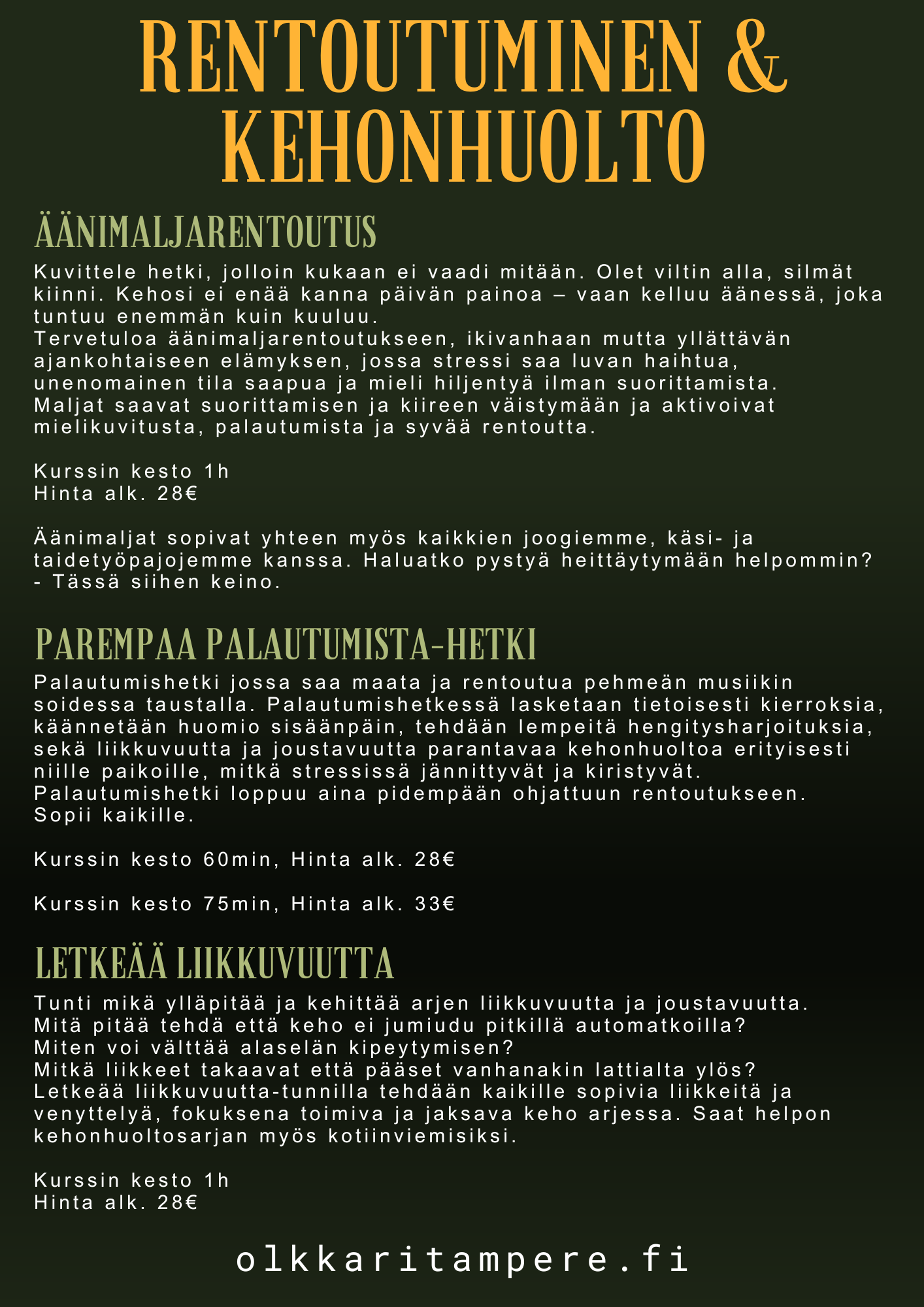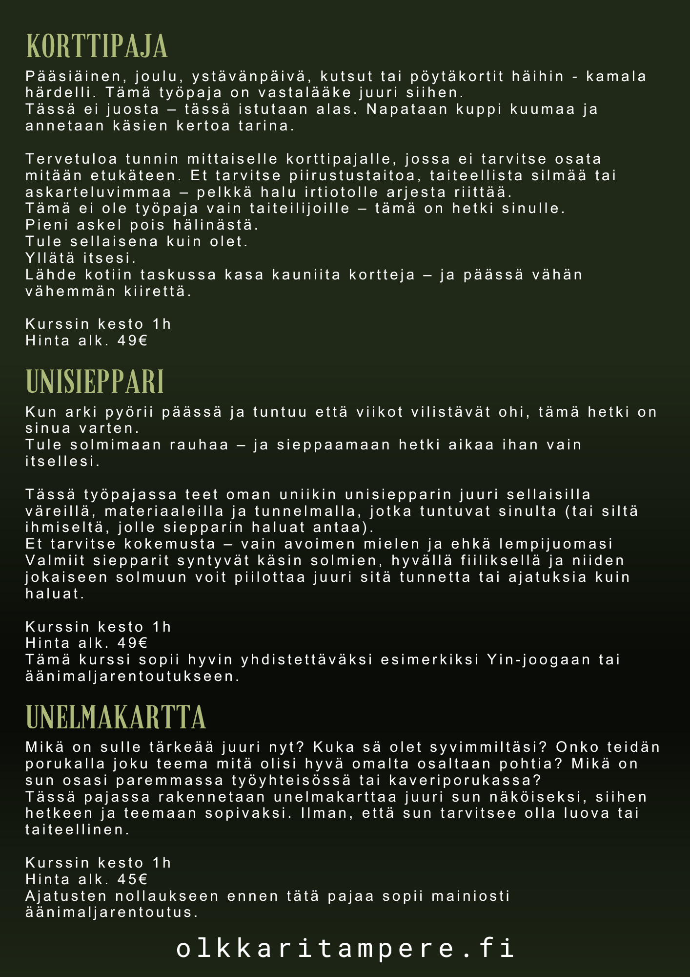 Räätälöimme juuri teidän toiveita ja budjettianne vastaavat paketit. Tilamme muuntautuu aina joogatilasta käsityöpajaan asti. Olkkarilta löydät eri alojen ammattilaisten tarjoamia palveluita, jotka kaikki tähtäävät hyvään fiilikseen ja oloon. Tekeminen on matalan kynnyksen toimintaa ja arjen kiireet jää meillä kenkien kanssa eteiseen.